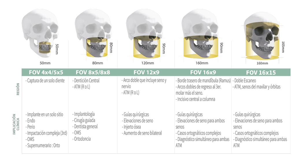 La selección de FOV se adapta a tus necesidades de diagnóstico: 16×15 (opcional), 16×9, 12×9, 8×9, 8×5, 5×5 y 4×4. Estas opciones abarcan toda la región del arco, seno y ATM (izquierda /derecha) y se adapta a la mayoría de los casos de cirugía y cirugía de implantes múltiples.