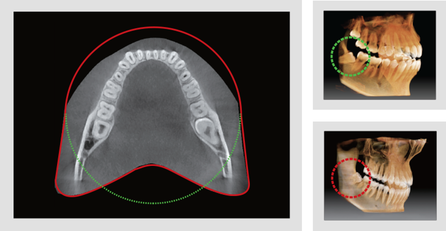 El innovador FOV de Smart Plus proporciona un volumen en forma de arco, que muestra una vista más amplia de la dentición en comparación con otros dispositivos del mismo campo de visión. Para los terceros molares, existe una alta posibilidad de que el diente se corte de la imagen. El “FOV de arco extendido” elimina esta posibilidad y proporciona al médico toda la dentición necesaria para un diagnóstico completo.